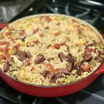 Add rice and sausage to the tomato mixture and bake, covered, at (350) for about 55-70 minutes, or until rice is tender. Remove the dish from the oven and allow rice to rest, covered, for 5 more minutes.